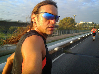 al rato me cogen dos corredores, de Alburquerque, creo que hacían el maratón, imagino, los jodíos no llevaban nada encima ni una miserable riñonera!! Estamos un rato hablando, me felicitan or la carrera, y me dicen que era el corredor con mejor cara y humor que habían encontrado en toda la carrera. La verdad, es que sería porque me encontraron en un tramo que  iba feliz, en el PAC 9 había estado con la familia y estaba contento.
